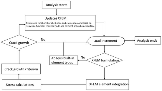 XFEM is a computational technique developed to address crack propagation challenges within the framework of the traditional finite element method (FEM). Its flowchart is shown in Figure 3. It expands upon classical FEM by incorporating the concept of partition of unity, allowing for the seamless integration of localized enrichment functions into the finite element approximation. This integration is facilitated by specialized enriched functions along with additional degrees of freedom, ensuring the presence of discontinuities within the model. Unlike conventional methods, XFEM simulations of crack propagation do not necessitate predefined crack paths or initial crack definitions that conform to the structural mesh. Instead, the crack path emerges as part of the solution process. When it comes to fracture analysis, the enrichment functions usually comprise a discontinuous function that represents the displacement leap over the crack surfaces and near-tip asymptotic functions that capture the singularity close to the crack tip (Equation (1)).