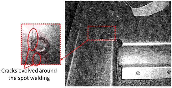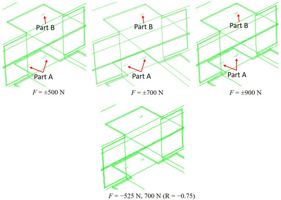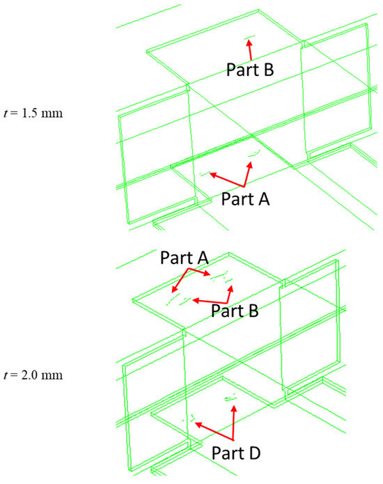 Figure 4 presents the formed cracks leading to the assembly’s failure for two configurations. In the first one, the cracks emerged and grew in Part A around the spot welds connecting Parts A and D on both sides and also in Part B connecting Parts A and B on the right side only. In the latter, different crack patterns were noted, where the cracks formed in both Parts A and B around the spot welds connecting these two parts and also in Part D connecting Parts A and D on both sides. The experimentally observed crack propagation is shown in Figure 5. In Ref. [20], only the crack formed around the spot weld connecting Parts A and B was presented; no information about the other cracks was given.