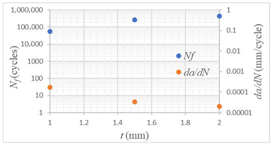 One variable that could influence the bending performance of the assembly is the diameter of the spot weld. This study examined three scenarios, adjusting the diameter from 4.5 mm to 6.5 mm in 1.0 mm increments, while keeping the thickness constant at 1.5 mm. The corresponding Nf and the average crack propagation rate (da/dN) are presented in Table 3. As the diameter enlarged from 4.5 mm to 6.5 mm, Nf rose to 48,914, 270,210, and 442,380, respectively, with Nf increasing by 5.52 and 1.63 times as the diameter increased by 1.22 and 1.18 times. The average crack propagation rate was calculated for each configuration using (af − a0)/Nf, where a0 and af represent the crack lengths at the end of the static cycle and at N = Nf, respectively. This rate decreased from 1.53 × 10−4 mm/cycle to 2.16 × 10−5 mm/cycle, a reduction of about 7.1 times, as the diameter increased from 4.5 mm to 6.5 mm. It was determined that when the nugget’s diameter shrank, the crack propagated more quickly because the smaller spot-welding size could not assemble the parts adequately. In this case, it was found that the spot weld’s size had a major impact on the structure’s fatigue performance. This is in line with what was shown in [21], where longer fatigue lives were achieved by larger nugget diameters because of the notch effect. This resulted in lower strains and stresses developing close to the spot-welding site, which decreased the likelihood that fractures would emerge.