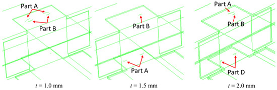 Second, a study was conducted to determine how a spot-welded box’s torsional fatigue life is impacted by the thickness of its assembly components. The thickness was changed from 1.0 mm to 2.0 mm in increments of 0.5 mm. Figure 7 displays the Nf values obtained: 54,929, 270,210 and 440,310 cycles, respectively. With a thickness of 1.0 mm, the Nf was over eight times lower compared to that with a thickness of 2.0 mm, indicating a weaker structure where cracks propagated more rapidly under bending stress (the average da/dN increased more than 8.55 times from 2.01 × 10−5 to 1.72 × 10−4 mm/cycle), resulting in shorter fatigue life. Figure 8 shows the crack patterns after reaching Nf for each thickness. At 1.0 mm, cracks appeared only in Parts A and B around the spot welds connecting them. When increased to 2.0 mm, cracks also formed around the spot welds in Part D connecting Parts A and D and on the right-side spot welds in Parts A and B. Thus, component thickness significantly influences the failure pattern of the assembly under bending load.