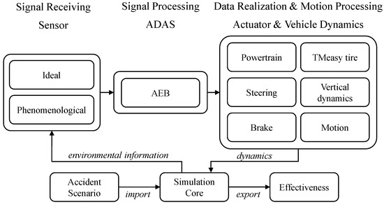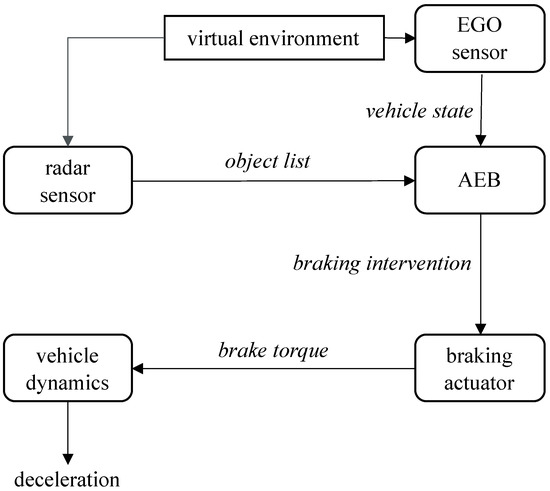 The following section provides an overview of the system components used and set up for our assessment. The system will be presented starting with the detection of the environment by a phenomenological radar sensor via the data processing by the AEB component up to the realization of the target variables in the vehicle dynamics model by actuators (Figure 2).