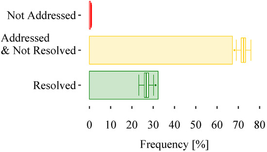 When using the phenomenological sensor model, the effectiveness of the system is reduced (Figure 5). A median of 26.7% of cases are resolved. This corresponds to a reduction of 5.6 percentage points (pp) related to the best-case assessment with the ideal sensor. Moreover, 72.4% (+6.2 pp) of the scenarios are addressed at the median, and in 0.8% (+0.3 pp), no intervention could be identified. The main dynamic of the noisy inaccurate phenomenological sensor signals can be seen in the gray and green spots. Cases that are not addressed in the ideal state are mostly not addressed in the phenomenological state. Only a few cases, in which the AEB calculates a lateral overlap due to a measurement error, switch in the category to the gray spots. That leads to a span in the white spots of 0.42% over the one thousand simulation runs. The span in the green spot is 7.84%, and in the gray spot with 7.72%—it is similarly large. This can be explained by the delayed intervention times, which can occur due to poorer object detection. Due to the inaccurate distance and speed measurement, the required avoidance acceleration and the TTC can be determined less accurately. Cases that could be solved in the ideal state are still addressed, but the time of intervention and delay are no longer sufficient. More robust driver assistance systems can handle these disturbances in a better way, resulting in a smaller span and effectiveness closer to the ideal condition. In terms of this AEB, the metrics shown in [25], which were used to model the system, need to be extended for a more robust intervention strategy in the case of inaccurate data. The following points can be added for a more robust design: