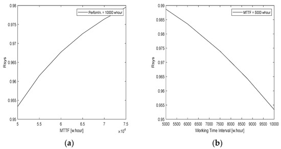 - The diagrams of Figure 2 demonstrate that the investigated system’s reliability is nonlinear and depends on the MTTFs of its elements and the performance indicator intervals.