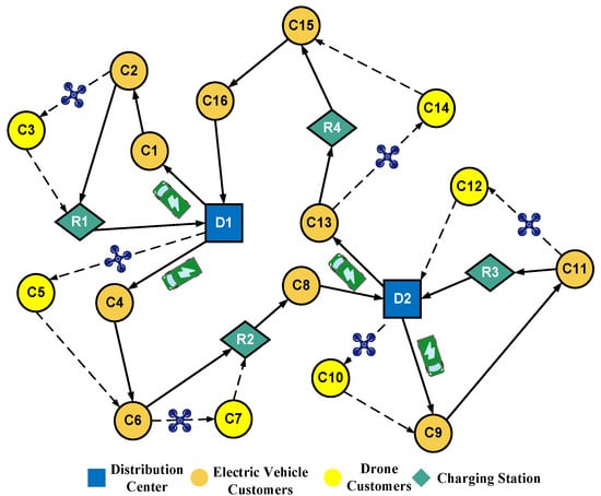 - Drone recovery strategy: After assigning a launch node to each drone, search for a suitable recovery node based on proximity. Traverse each EV route to locate the drone’s launch node, then examine all potential recovery nodes—including charging stations and distribution centers—moving toward the route’s end node. Suppose the flight distance from the launch node to the customer node, followed by the distance to the potential recovery node, does not exceed the drone’s maximum flight distance: in that case, the node is designated as the recovery point.