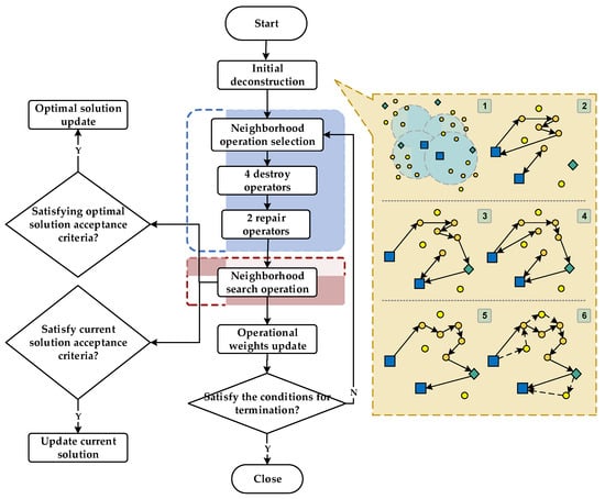 Our proposed multi-depot EV–drone collaborative-delivery routing optimization problem is apparently classified as NP-hard. We have developed an improved adaptive large-neighborhood search (ALNS) algorithm to solve the MD-EVDRPTW model. The framework of the proposed algorithm is presented in Figure 2.