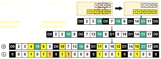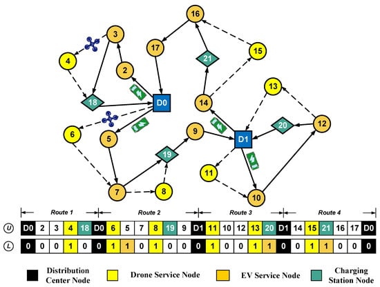 From the three rules described above, the following can be inferred: when a sequence of Ⓛ contains a coded “1”, the first “1” represent a customer node served by a drone. In this case, the drone’s launch and recovery nodes correspond to the nodes of Ⓤ that are immediately preceded and followed by “0”s in the sequence. Figure 3 illustrates an example of a delivery route solution with 2 distribution centers, 16 customer nodes, and 4 charging stations, along with the corresponding route encoding method.