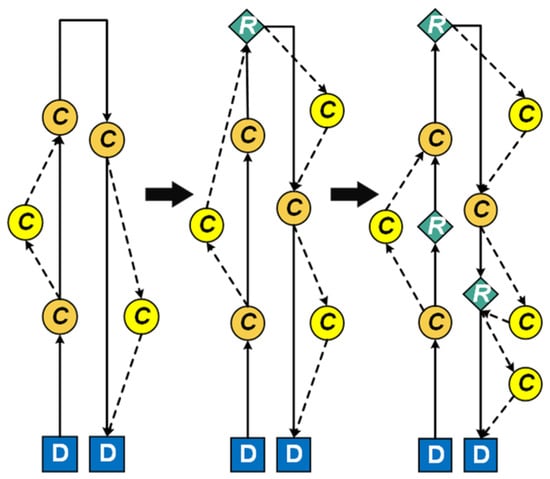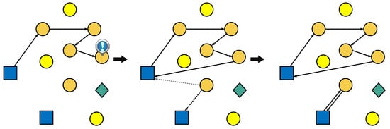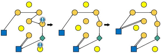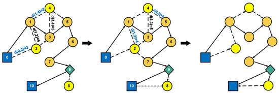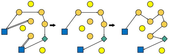 First, a threshold value is established for the number of customer nodes to be merged. Customer nodes that do not meet this threshold are extracted from the routes, leading to the deletion of those routes. The removed customer nodes are then reinserted into the existing routes using the customer node insertion method described in Step 2. New routes are created using the same method if this insertion fails. Once the integration and optimization process is complete, the objective function values of the old- and new-route sets are compared, and the more efficient set of routes is retained. The route integration optimization process is illustrated in Figure 9.