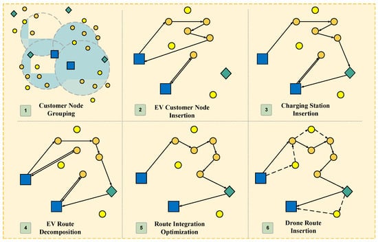 Constructing a high-quality initial solution is critical for the efficiency and effectiveness of the improved ALNS algorithm, as it directly impacts both the search process and the final solution. In this paper, we generate a high-quality initial solution through six key steps: customer node grouping, EV customer node insertion, charging station insertion, EV route decomposition, route integration optimization, and drone route insertion. The overall construction process is illustrated in Figure 5, with the detailed steps outlined in the following.