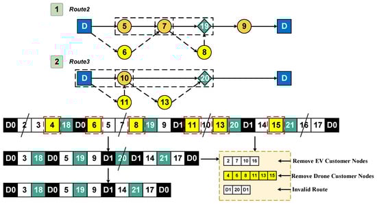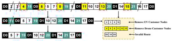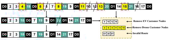 As illustrated in Figure 12, the cost value for each EV customer node is calculated and sorted after multiplying each value by a random number between 0 and 1. Nodes 16, 9, 2, and 3 are then selected for removal in order from the highest to the lowest cost. After removing the drone customer node, a new invalid route 0 → 18 → 0 is generated, which is subsequently eliminated.