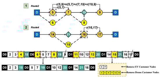As illustrated in Figure 13, we randomly select customer nodes 5 and 16 from the current solutions of Routes 2 and 4. Taking Route 2 as an example, the correlation between neighboring customer nodes 5 and 7 is denoted as . For non-neighboring nodes, the correlation is calculated by summing the computed values across multiple segments; for instance, the correlation between nodes 5 and 9 is given by , which includes the distances to and from any charging stations, if applicable. After calculating the correlation for the current node against all subsequent nodes, each correlation value is multiplied by a random number in the range of 0 to 1. Subsequently, customer nodes 9 and 17 are removed in descending order of their calculated values, followed by the removal of the drone customer node.