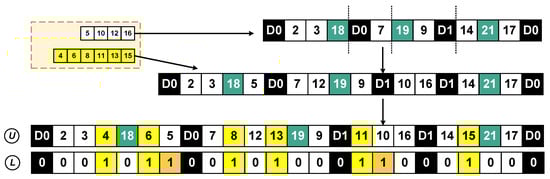 Using integer arrangement coding, we assume that the road network contains customer and charging station nodes, as well as distribution centers, represented by the natural numbers . An initial solution consists of two codes: an upper code, denoted by Ⓤ, representing the vehicle path, and a lower binary code of the same length, denoted by Ⓛ, which is used to determine the service type for each customer node. A non-negative integer value is assigned to distinguish customer nodes based on the following rules: