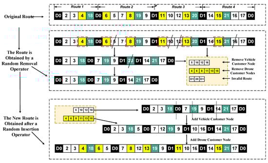 After the improved ALNS algorithm generates the initial solution, it proceeds to create a new solution through a process of destruction (“destroy”) and reconstruction (“repair”) [17]. This paper aims to minimize the delivery costs of the EV and drone routes. To facilitate this, we have designed four removal operators (i.e., destroy operators) and two insertion operators (i.e., repair operators), which address delivery costs and randomness during the destruction and reconstruction processes. Additionally, these operators incorporate perturbation mechanisms to enhance solution diversity in the neighborhood search process.