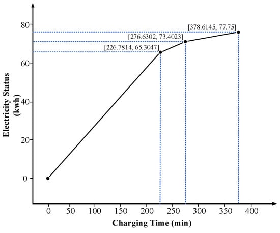 During the distribution process, EVs must visit charging stations to ensure they have sufficient power for continued operation. With the inclusion of charging stations, two additional factors must be considered: (i) the EV charging process is nonlinear, due to variables such as battery performance and heating effects (as described by Montoya et al. [26]); and (ii), while the EV is charging, the station can be treated as a special customer node, without delivery demand or time window constraints, and can be used as a launch and recovery point for drones as part of the drone deployment and retrieval strategy.