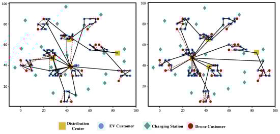 The experimental results show that the average delivery cost in the multi-depot model is 1894.09, significantly lower than the 2307.87 average cost in the single-depot model. In every test case, the multi-depot model outperforms the single-depot model, demonstrating clear advantages in delivery-route optimization and cost reduction. In the single-depot model, EVs must travel longer distances for deliveries and return trips. Conversely, in the multi-depot model, EVs and drones can depart from the distribution center closest to the customers and return to the most convenient one, allowing for greater flexibility and shorter routes, which helps minimize unnecessary return distances and total delivery costs.