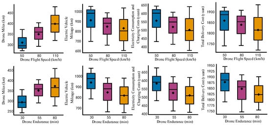 Based on the experiments, the sensitivity analysis of drone parameters is presented in Figure 22. By comparing the data from Table 7 and Figure 23, the following can be observed: as the drone’s flight speed increases from 50 km/h to 110 km/h, its flight mileage grows by an average of 28.64%, the EV’s driving mileage decreases by 10.19% on average, electricity consumption and charging costs improve by 9.59%, and the total delivery cost is reduced by 1.44%, on average. The algorithm produces better solutions when the drone’s speed surpasses the upper limit of the EV’s traveling speed and the proportion of customers served by the drones increases. This occurs because the optimal solution to the MD-EVDRPTW problem favors maximizing drone dispatch to improve delivery efficiency, which also helps minimize EV mileage. However, as the drone’s mileage increases, the associated transportation costs rise, leading to less noticeable optimization in the overall delivery cost. Similarly, when the drone’s battery life extends from 30 to 80 min, the drone’s flight mileage increases by an average of 23.65%, EV driving mileage decreases by 13.37%, electricity consumption and charging costs are optimized by 11.98%, and the total delivery cost is reduced by 2.60%. These results align with the previous conclusions.