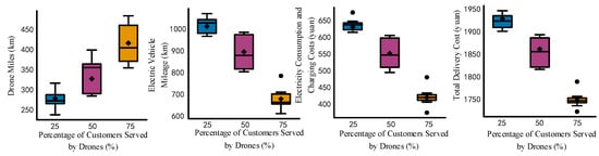 As the number of customers meeting the drone payload requirements increases, the algorithm will more likely assign EV target customers to the drone service during the customer-type screening process. From the analysis results in Figure 24, it is evident that when the proportion of customers meeting the drone payload rises from 25% to 75%, the drone’s flight mileage increases by an average of 48.90%. In comparison, EV mileage decreases by 32.90%, on average. Additionally, electricity consumption and charging costs improve by 33.45%, and the total delivery cost is reduced by 8.95%, demonstrating a notable optimization effect.