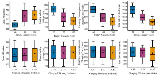 Based on the experiments, Figure 25 presents the sensitivity analysis results of EV parameters. The following conclusions can be drawn by combining Table 8 with Figure 25. When EV battery capacity increases from 60 kWh to 100 kWh, the drone flight range improves by an average of 34.59%, while EV driving range decreases by an average of 14.88%. Electricity consumption and charging costs are optimized by an average of 16.44%, and the total delivery cost is reduced by an average of 3.69%. When the charging efficiency increases from 3.47 kWh/min to 4.87 kWh/min, drone flight mileage shows a minimal increase of 0.04%, EV driving mileage decreases by an average of 0.16%, electricity consumption and charging costs improve by 0.88%, on average, and the total delivery cost is optimized by only 0.26%.