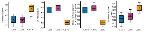 Based on the experiments conducted, Figure 26 presents the sensitivity analysis results regarding the time-varying characteristics of EV driving speed. Examining Table 9 alongside Figure 26 shows that the results vary across the three time-varying scenarios. When transitioning from Case 1 to Case 2, the number of drone customers remains constant, and there is no significant change in drone flight mileage. However, the EV driving mileage, electricity consumption, and charging costs experience modest increases, averaging 3.73% and 4.75%, respectively, while the total delivery cost rises by an average of 1.28%. In contrast, when moving from Case 1 to Case 3, the number of drone customers increases, resulting in an average flight mileage increase of 31.14% for drones. Conversely, the driving mileage of EVs and the costs associated with electricity consumption and charging show significant decreases, averaging 27.88% and 28.27%, respectively, while the total delivery cost increases by an average of 4.62%.