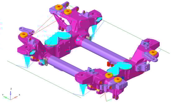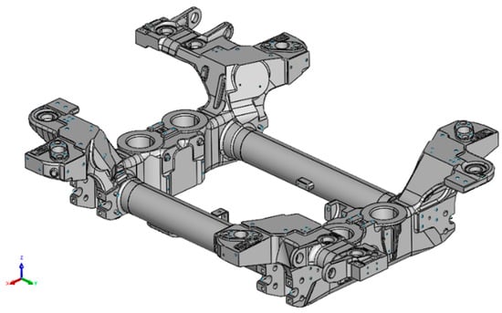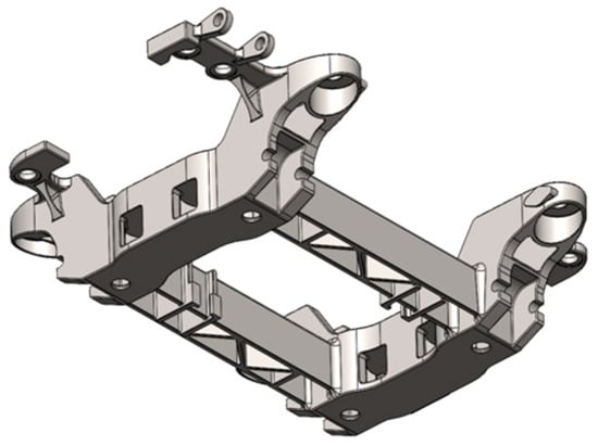 The next step involved reconstructing the geometry of the frame as shown in Figure 9. This new design is highly innovative compared to more conventional geometries, such as the original one. The bodies of the longitudinal beams are hollow as are those of the crossbeams. The crossbeams also feature additional internal reinforcements that ensure the strength and stiffness of the entire frame. Moreover, their presence enhances the casting process by creating a much better flowability condition for the molten material. The two crossbeams have their openings facing downward. This design choice proved to be crucial as it prevents the accumulation of debris during vehicle operation, thereby reducing potential sources of damage. The interface area of the secondary suspensions includes an additional cavity. The supports have retained their geometry at the interface zones, while being globally streamlined and adapted to the new production process, with larger fillet radii and smoother shapes. The large central holes in the longitudinal beams allow for a significant reduction in mass but require the addition of cores to the mold used for production.