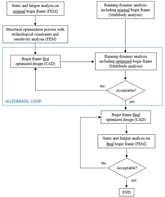 Nowadays, railway vehicles stand out as one of the optimal solutions for sustainable mobility, aiming to reduce air pollution generated by various types of land and non-land vehicles. The growth of the railway sector necessitates addressing new challenges in both vehicle design and management. A critical aspect of this involves the integration of running dynamics analysis with structural optimization to enhance performance and safety. Running dynamics analysis is crucial for understanding the operational behavior of railway vehicles, leading to improved stability and passenger comfort. When combined with structural optimization, this approach allows for the design of components that are not only lightweight and durable but also capable of maintaining optimal performance under varying operational conditions. This synergy can lead to significant advancements in the efficiency and reliability of railway systems. The focus of this research activity was the innovation of a motor bogie mounted on a tram vehicle. Redesign of this component was achieved through a combination of key tools used in the railway sector for the development of such components: the creation of a high-level Finite Element (FE) model, the addition of a complex structural optimization calculation, the reconstruction of a CAD model, and the development of a multibody model. The ability to effectively and automatically integrate these environments while adhering to all relevant European design standards represents the novelty of this activity, along with the innovative design and validation of the bogie. Structural optimization processes have yet to establish themselves in the railway field, especially as an optimization method. The present research activity has confirmed the potential of this tool in which technological constraints were also included to ensure that the optimized geometry could be produced using a sand-casting process. The results were excellent, as was the impact of a sensitivity analysis, which significantly reduced computation times. Finally, the automation of multibody analyses to study the running dynamics of the entire vehicle, including optimized geometries, further increase the efficiency of the design process. Having a replicable bogie frame model would lead to a significant reduction in production times, both during initial construction and when repairs or component replacements are needed due to damage. In order to reach these objectives, topological structural optimization processes are essential tools that support the design and development phases of the system in question. The literature highlights that topological structural optimization approaches have yet to gain widespread acceptance in the railway field, as well as a design procedure capable of efficiently integrating an FE model, a CAD model, and a multibody model. This aspect is even more accentuated for tram vehicles, which are the focus of the present work. In general, topological and structural optimization processes are effective techniques for designing various types of components. A suspension system adopted in automotive applications has been studied to emphasize a weight reduction [1]. An automotive car body was optimized through material performance indices [2], and a high-performance chassis design of an automotive vehicle body has been innovated using topological optimization [3]. Comparable methods have been applied to enhance the design process for turbomachinery components [4], particularly when integrated with additive manufacturing techniques [5,6,7,8]. Moving to railway applications, the modal behavior of a car body structure was included in a size optimization approach testing an innovative design approach [9]. In addition, composite structures were integrated and optimized, testing their structural and dynamic behavior [10]. Another similar activity regarded an anchor bracket, developed using topological optimization applied on composite materials [11] and a composite wagon [12]. A new generation of freight railway wagons was developed and proposed in [13]. Numerous researchers focused on optimizing car bodies with an emphasis on lightweight design processes [14], using a material selection method [15] or a multidisciplinary approach [16]. A recent optimization application based on a sensitivity analysis for a railway vehicle body is presented in [17]. With reference to manufacturing constraints, the bolster beam and the bogie frame of a freight wagon were optimized to reduce the mass of the system [18]. A topological optimization was conducted using Solid Isotropic Material with Penalization (SIMP) methodology to maximize the stiffness of the structure. Two casted parts were compared, highlighting the impact of manufacturing constraints in the optimization process [19]. Additionally, the existing literature emphasizes the critical importance of accurately predicting the lifespan of railway bogie frames. An FE model and multibody dynamics model were simulated to study the behavior of bogie frames under real operational service loads [20]. A similar approach was adopted to test the crashworthiness performance of a passenger rail vehicle locomotive [21]. The dynamic response acting on a high-speed train was analyzed using a rigid-flexible coupled vehicle dynamic model [22]. The bogie frame of a diesel multiple unit (DMU) was studied using stress and acceleration tests to clarify the reasons for fatigue cracking [23]. With reference to railway dynamics in general, a dynamic model for an asymmetrical vehicle/track system was proposed in [24], while the performance of a pantograph–catenary system was analyzed in [25]. However, all the proposed techniques focused on evaluating vehicle performance, neglecting the aspects of component redesign and innovation. It confirms the importance of the novelty proposed in this research activity, where a complex component like a tramway bogie frame was innovated combining all the main 