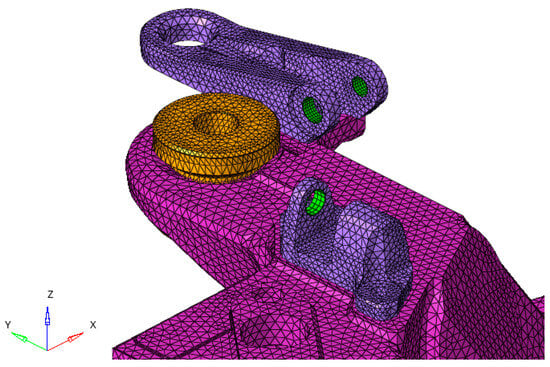 Figure 3 illustrates the FE model of the original motor bogie frame. It was a high-level representation of the system, where every part was modeled with different types of elements (0D, 1D, and 3D), according to component requirements. Due to the robust geometry of the frame, characterized by thick sections and three-dimensional development geometries, it was not feasible to represent it using the mathematical formulation of 2D shell elements (QUAD type). All the main components, including longitudinal beams, cross members, and various supports, were modeled with a three-dimensional mesh of second-order TETRA elements (TETRA10 type), adapting the element dimension to the various parts of the bogie. The choice of different types of elements depended on the characteristics of the modeled components. Figure 4 shows a detailed view of the mesh. All the supports were connected to the main frame, using contacts formulation, specifically using freeze/bonded contact. This type of contact configuration imposes the linearity of the model, and the correct redistribution of all the acting stresses (both forces and moments). It enforces zero relative motion on the contact interfaces, and the gap between them remains fixed at the original value fixed by the user. The sliding distance is forced to be zero. This choice allowed accuracy of the results and simplicity of the modeling. Moreover, the model is easier to manage as the various components can be modified independently. It is sufficient to maintain the interface between the components to ensure the connection remains active, expediting potential changes and numerical tests. Depending on the type of loads and the zone of application, forces, pressures, and RBE3 elements were used to load the bogie frame. Using RBE3 elements allowed exclusion of the addition of stiffness to the model, distributing force and moments among the selected nodes. The wheelsets were represented with one-dimensional elements. In detail, a series of connected beams with the proper section dimensions and shape were used. This modeling choice gave the right mass and inertial characteristics to the model, without losing the flexural behavior of the component. The primary suspension (light blue color) mounted between the wheelset and the bogie frame was also modeled using one-dimensional elements, following the same concept described above. Accurately representing this system was critically important as it was vital to precisely replicate this connection point. It was necessary to avoid introducing overly rigid constraints that could create excessively high stresses, leading to unrealistic results. Global constraint conditions applied to the bogie frame; all load cases were represented by an isostatic configuration. The reference points were the four wheels, positioned at the end of the axle.