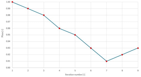 Once the optimization process was completed, an initial material density distribution was obtained, as shown in Figure 7. The red zones represent areas where the material is necessary and cannot be removed to ensure the required performance of the frame in accordance with optimization process settings. Moving towards the lower end of the scale, represented in blue is material that can be removed. As shown in the reference figure, the solver generated large cavities both in the longitudinal beams and crossbeams. This significant result positively directs the component toward the sand-casting production process thanks to the technological constraints introduced in the optimization calculation. Figure 8 shows the trend of the objective function during the optimization process, highlighting the 7% mass savings achieved.