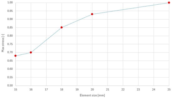 The bogie frame was tested again for fatigue under load conditions specified by the reference standard. Specifically, seven static conditions and nine fatigue conditions were analyzed. The FE model of the bogie frame was tested by verifying the performance in terms of stress at each node of the structure grid. Starting from the local stress tensor, it was possible to determine the resultant of the principal stress components. The values obtained were compared with the reference allowable limits. Before proceeding with the calculation, the model was subjected to a sensitivity analysis that took into account the effects of mesh size on the maximum stress value. The results are shown in Figure 11, where it can be observed that variation in the normalized maximum stress value is less than 3% after the last two iterations, confirming the stability of the FE model.