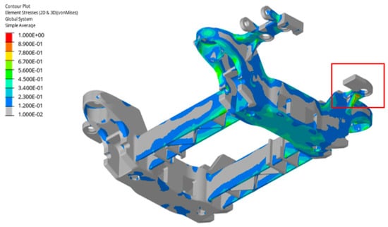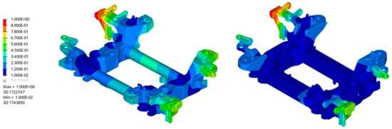 Table 1 summarizes the results obtained from fatigue calculation, exploiting the utilization coefficient of the material, defined as the ratio between the stress calculated value and permissible value. The results were positive, with only one critical area characterized by a utilization coefficient larger than one, identified at the base of a support on the extremity of the longitudinal beam (as indicated by the square in Figure 12). Stress values have been normalized to the maximum observed in the original bogie configuration. The stress permissible value has been expressed as a range.