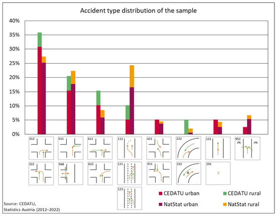 Out of the approximately 4750 road accidents in CEDATU, 38 accidents of HGVs with cyclists were available for the study. Most of them are accident scenarios in which the HGV was turning right and the cyclist was going straight ahead (accident type number 312, Figure 1). This corresponds very well with the national statistics Austria, in which the right-turning HGV is also the most frequent type of accident involving a cyclist. Furthermore, crossing accidents (accident type number 511), accidents at entrances (accident type number 948), and accidents in which the HGV is turning right or left (accident type number 622 and 611) are of importance. Overtaking accidents (accident type number 112) and lane change accidents (accident type number 121 and 123) are the second most important in the national statistics but are underrepresented in the CEDATU sample. Approximately three quarters of the accidents in the sample took place in an urban area, which corresponds very well with the figures in the national statistics (Table 1). The sample of CEDATU accidents covers approximately 60% of the accidents in the national statistics.