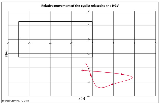 The accident is now reconstructed to such an extent that a sufficiently long time history of the speed and acceleration before the collision is available. Figure 3 shows the relative trajectory of a cyclist in relation to the HGV as an example of an accident with a truck turning right and a cyclist going straight ahead. The collision position was on the right side of the truck. The relative movement looks quite strange. This is because the truck first has to steer slightly to left in order to be able to turn right at the junction. Due to the different relative speeds at certain points in time, the cyclist is in front of the truck and then falls behind when the truck is traveling faster than the cyclist.