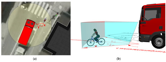 (a) Longitudinal and lateral distances for detection of cyclists and (b) vertical view of an assistance system that fully detects the cyclist.