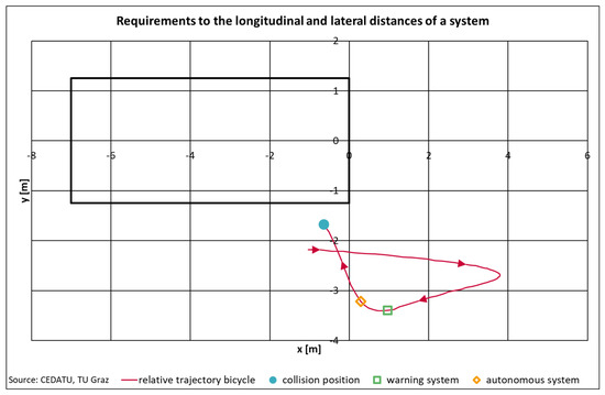 Based on the assumptions made, a warning system would require a visibility range of approximately one meter in the longitudinal direction and 3.5 m in the lateral direction (Figure 5). An autonomously intervening system would require approximately 0.3 m in the longitudinal direction and a lateral view of 3.3 m to avoid this collision. The collision takes place at the end of the bicycle’s trajectory, which is in the front lateral area of the truck. The field of view of an assistance system is based on complete avoidance of a collision independent of visual obstructions caused by any objects (e.g., hedges, fences, etc.). The field of view therefore refers to an ideal system, and thus the ranges refer to theoretical configurations.