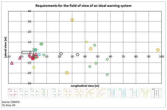 Theoretical requirements for the longitudinal and lateral field of view of an ideal warning system for the different accident types. A description of the accident types is given in Appendix A.