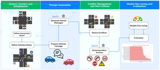The proposed framework for introducing LLMs as traffic control system and evaluating its performance in real time is shown in Figure 2. It broadly comprises four key stages, including data creation and initialization, prompt generation, conflict identification, and fine-tuning and model analysis.