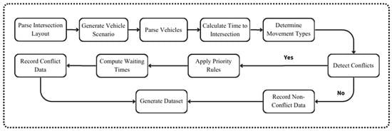 The creation of vehicle scenarios requires careful consideration of conflict detection, which involves several successive steps. First, the system analyzes whether a particular type of movement may cause intersecting paths between vehicles. For example, vehicles moving in opposite directions without turning may not cross each other’s paths at all. Then, it assesses whether any vehicles are likely to arrive at the intersection within a close time interval, potentially creating conflicts. To handle these identified conflicts, the system applies traffic priority rules to determine if a vehicle should yield. Factors such as arrival times and relative positions are considered when developing these rules based on movement types—left, straight, or right. The system also calculates waiting times at the junction for lower-priority vehicles, as illustrated in Figure 4, where conflicts and priority decisions, including waiting durations before movement, are captured.