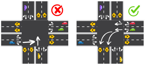 First, the intersection layout is parsed to obtain information concerning individual lanes and possible destinations from any given lane. Vehicle movement analysis is made more accessible and facilitated by storing the layout in a structured JSON format. Parsing helps in understanding how the intersection is arranged, which is essential when it comes to determining where vehicles will pass and where there may be danger of accidents occurring. We assumed the initial testing to be carried out on a multi-lane four-legged urban intersection, where vehicles can travel in different directions, as shown in Figure 4. Each of its legs has lanes marked for specific purposes, including moving forward only and taking left- or rightward turns. This allows traffic from all directions across the ‘cross’ section, with left and right turns facilitated by specific lanes to avoid any conflicts with traffic. As shown in Figure 4, each approach leg is marked with the corresponding lane arrows to accurately reflect valid turning movements.