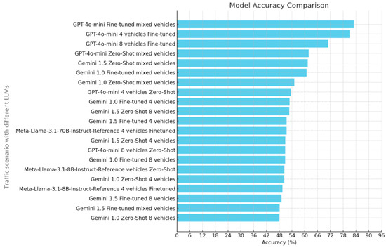 Accuracy comparison across various LLMs, learning methods, and vehicle scenarios.
