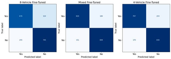 To understand the performance of the fine-tuned GPT-mini models, confusion matrices were analyzed for the best-performing models. Figure 7 presents the confusion matrices for the GPT-4o-mini models in different scenarios. The mixed-vehicle fine-tuned GPT-mini model exhibits the best performance among the three, with a higher number of true positives (820) and true negatives (849), and lower false negatives (180) and false positives (151). This indicates that the model is proficient at correctly identifying both conflict and non-conflict scenarios. Comparing the fine-tuned GPT-4o-mini model for four vehicles to the mixed model, we observe slightly lower true positives (797) and true negatives (830), and higher false negatives (203) and false positives (170). This suggests that the model trained exclusively on four-vehicle scenarios may not generalize as effectively as the mixed model, leading to a higher rate of misclassification. The eight-vehicle fine-tuned GPT-mini model shows a decrease in performance compared to the mixed and four-vehicle models, with a higher number of false negatives (324) and false positives (255). This reinforces the earlier observation that scenarios with more vehicles introduce complexity that challenges the model’s ability to accurately classify conflict scenarios.