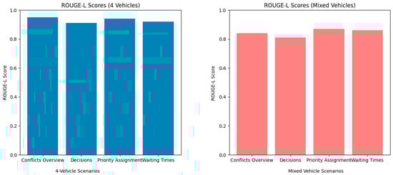 Figure 8 presents the ROUGE-L scores for various scenarios. In the four-vehicle scenarios, the fine-tuned GPT-mini model achieved high ROUGE-L scores across all components, with the conflicts overview scoring 0.95. This indicates that the model can accurately and coherently summarize conflicts in simpler scenarios. The decisions component scored 0.91, demonstrating the model’s ability to interpret and explain the decisions made based on traffic rules. The high scores in priority assignment (0.94) and vehicle waiting times (0.92) further showcase the model’s proficiency in assigning priorities and calculating waiting times for vehicles. For mixed-vehicle scenarios, the ROUGE scores are slightly lower but still strong. The conflicts overview scored 0.84, and the decisions component scored 0.81. These results suggest that as the complexity of the scenarios increases with varying numbers of vehicles, the model faces more challenges in summarizing conflicts accurately. However, the model maintains respectable performance, indicating its ability to handle complex scenarios effectively. The priority assignment and vehicle waiting times components scored 0.87 and 0.86, respectively, reflecting the model’s competence in applying traffic rules and calculating necessary delays even in more complex situations. The consistently high scores in the decisions component across both scenario types underscore the model’s strong grasp of traffic rules and its ability to apply them in diverse situations. The slight decline in scores for mixed-vehicle scenarios highlights the increased complexity but also shows that the model adapts reasonably well. These results demonstrate that the fine-tuned GPT-mini model excels not only in binary classification of conflict scenarios but also in generating detailed, coherent analyses. The model’s ability to maintain high performance across key components, even in complex scenarios, is promising for practical applications where detailed explanations are necessary.