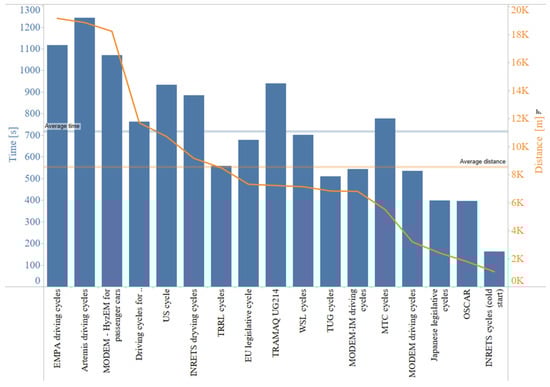 On the other hand, different regulatory programs that encompass various driving cycles are shown in Figure 2, where it can be seen that they have an average duration of 1118 s and cover 8.5 km. These criteria were considered for the development of the driving cycle of the present study and, in addition to being representative of the locality, were logistically feasible compared to other driving cycles.