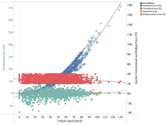 Figure 4 shows the interaction of drag forces and inertial forces with respect to speed, considering a constant slope of 11% for easier visualization.