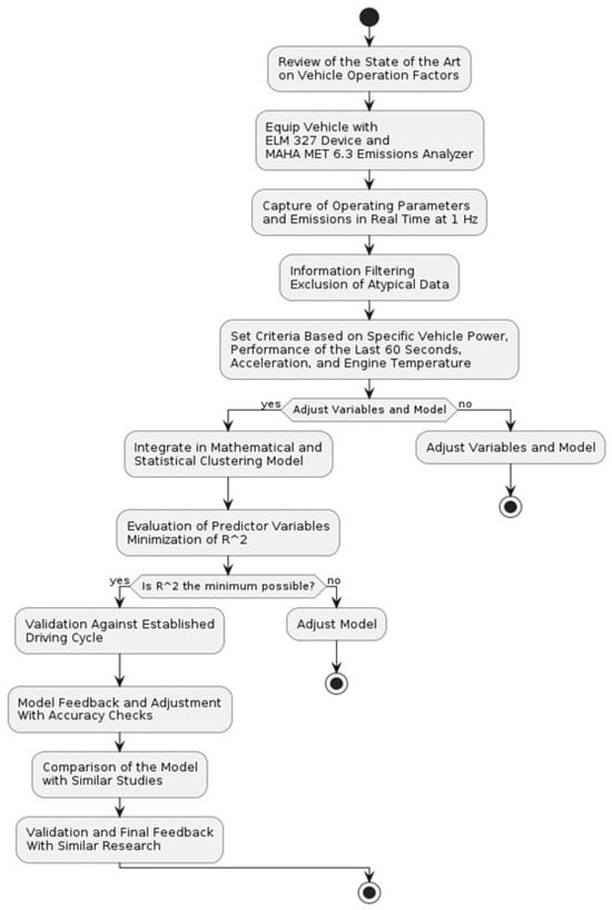 Through continuous feedback of the process with accuracy verifications, refinement and adjustment of the mathematical model were achieved, allowing for comparison with similar studies in the field. This methodological approach, as sketched in Figure 5, not only facilitates the accurate prediction of fuel consumption but also contributes to advancing knowledge for optimizing vehicle operation for greater energy efficiency.