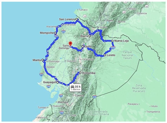 In this research project, the variability in fuel consumption and emissions in gasoline light vehicles was explored across a significant altimetric range, taking advantage of Ecuador’s diverse geography. For data collection, multiple routes were designed, covering altitudes from 0 to 4500 m above sea level. One of these routes is illustrated in the attached image, which is part of a larger set totaling over 400 h of collected data. This methodological approach allowed a comprehensive view of vehicle behavior under highly variable conditions, providing valuable insights into the environmental and energy efficiency implications at different altitudes.