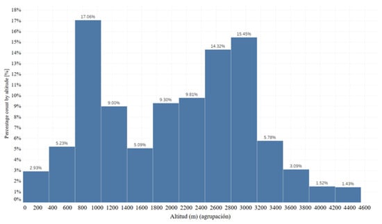 Figure 6 shows the geographical environment of the tests conducted in Ecuador, leveraging the country’s altimetric diversity, where it is possible to traverse from sea level to altitudes exceeding 5000 m above sea level within a compact geographical area. This variability is evident in Figure 7, which presents the percentage distribution of measurements according to the altitude at which they were conducted. This approach allowed a comprehensive qualitative and quantitative analysis of the impact of the different altitudes in the study, highlighting the significant contribution of this research in terms of the breadth and detail of the collected data.