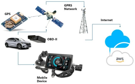 The data acquisition system utilized a Raspberry Pi 3, equipped with a GPS module, Bluetooth adapter, and network adapter. Data were transmitted to the cloud via a Huawei modem using 3G technology. The schematic of the connection is depicted in Figure 8.