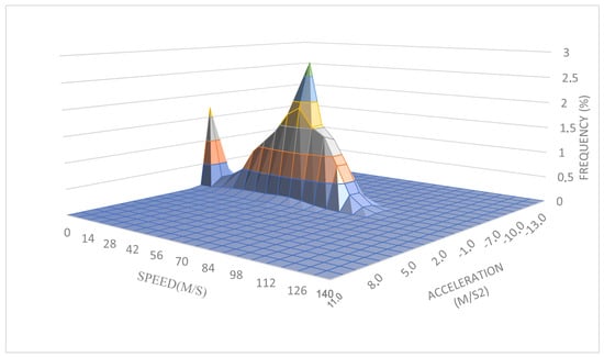 Figure 9 displays the collected data, which include the frequency distribution of speeds and accelerations. Throughout the analysis period, the parameters of speed and acceleration were analyzed, revealing that accelerations close to zero were the most common, and speeds varied from approximately 15.56 to 17.5 m/s.