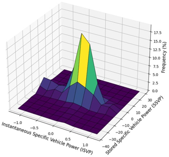 The presented Figure 11 shows a 3D surface plot illustrating the relationship between instantaneous vehicular-specific power (IVSP), stored vehicular-specific power (SVSP), and the frequency (%) at which these values were observed. This graph is fundamental for understanding how the storage and use of specific power could influence a vehicle’s energy consumption during a representative driving cycle. Through this visualization, specific patterns in the accumulation and use of energy can be identified, which is crucial for predicting vehicle performance and optimizing fuel or energy consumption.