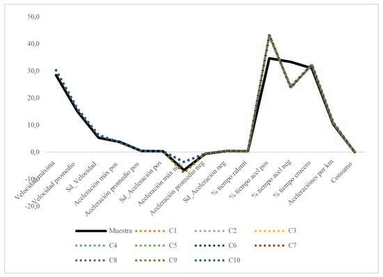 Figure 12 illustrates how the different characteristic parameters, derived from the analyzed cycle, fluctuated in relation to the comparative cycle. This variation allowed the evaluation of the representativeness of the parameters and the effectiveness of the interactions constructed by the software developed for cycle generation. The consistency and reduced variability between cycles, as shown in the figure, underscored the accuracy and reliability of the proposed method for simulating realistic driving conditions. Each line in the graph, representing different cycles, shows a similar trend at various points, highlighting the model’s effectiveness in replicating consistent conditions throughout the trials.
