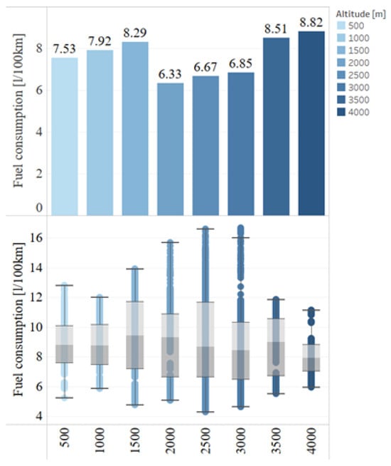 The results of the impact of altitude on fuel consumption are shown in Figure 13, where an increase in consumption with respect to altitude can be observed.