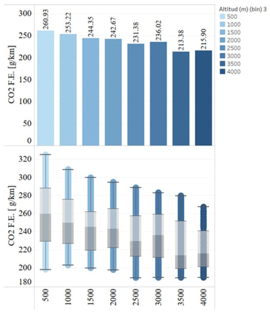 When applying the fuel consumption calculation methodology to the obtained driving cycle, the data reported were as shown in Figure 13. Additionally, it is possible to observe an increase in fuel consumption with the rise in altitude.